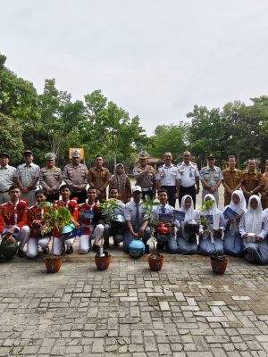 Sebagai bentuk nyata dari edukasi dan kepedulian, Ditlantas Polda Riau menyerahkan bantuan simbolis kepada siswa dan sekolah berupa helm, tumbler, buku ajar lalu lintas, serta bibit pohon untuk ditanam di lingkungan sekolah.