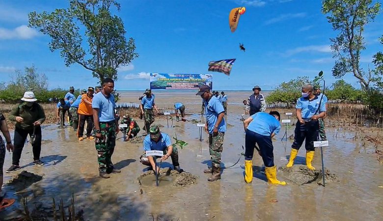 Balikpapan, gerbangdesanews.com-TNI AU. Program Penanaman pohon Mangrove dimaksudkan guna mengantisipasi terjadinya abrasi bibir pantai. Selain itu tanaman mangrove juga merupakan tempat subur untuk berkembang biaknya biota laut. Demikian sambutan Komandan Lanud Dhomber yang dibacakan oleh Kadispers Lanud Dhomber Letkol Adm Eko Fajar Budi H., S.E., dalam pelaksanaan program penanam pohon mangrove dalam rangka memperingati Hari Bhakti Ke-75 TNI Angkatan Udara.