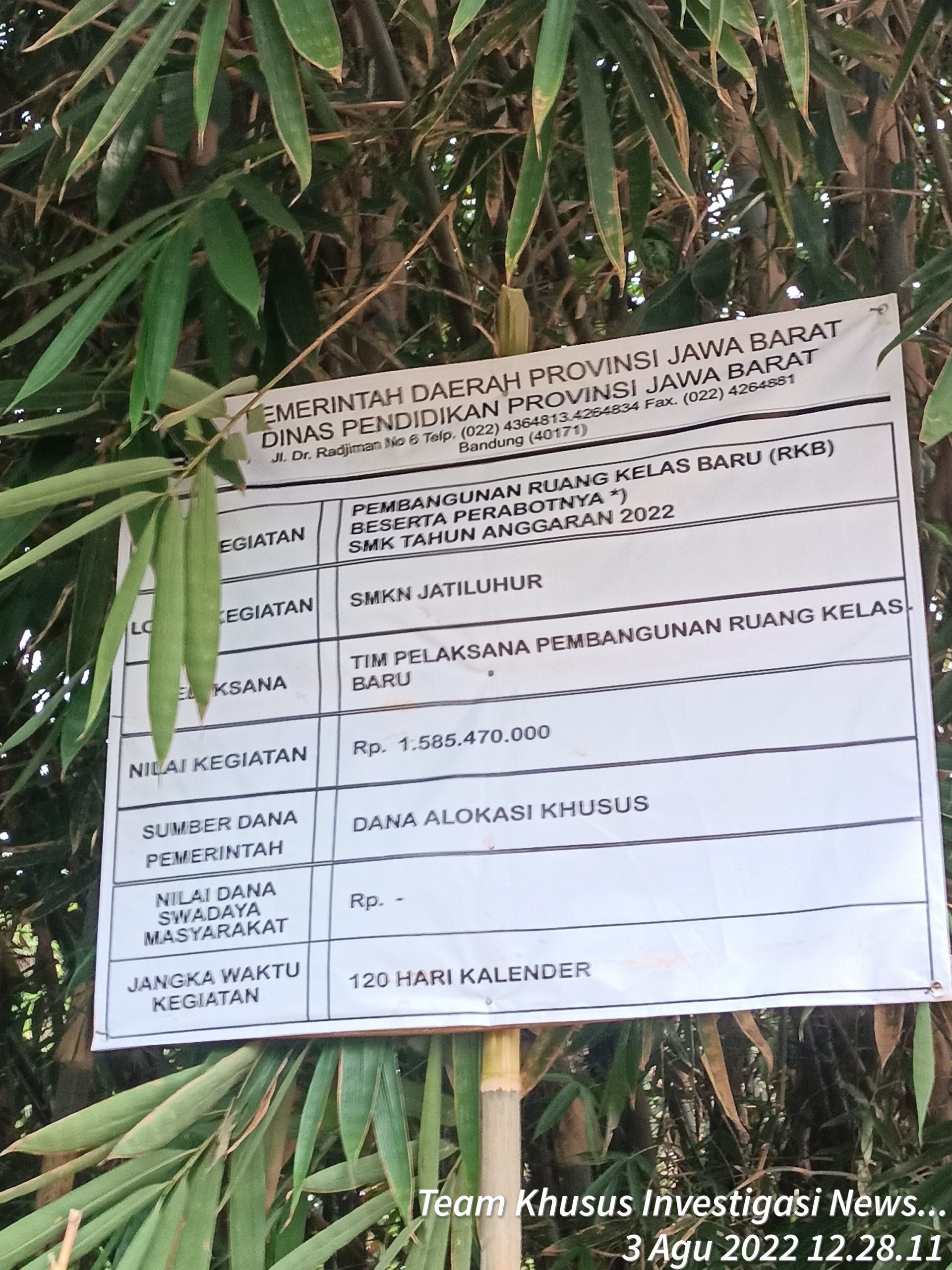 Pembangunan SMKN Jatiluhur dalam papan proyek di sebutkan menghabiskan Rp.1,585,470,000 ,- dalam 120 hari kalender ,dan untuk pelaksanaan nya melalui swakelola yang di bentuk langsung oleh kepala sekolah SMKN Jatiluhur,