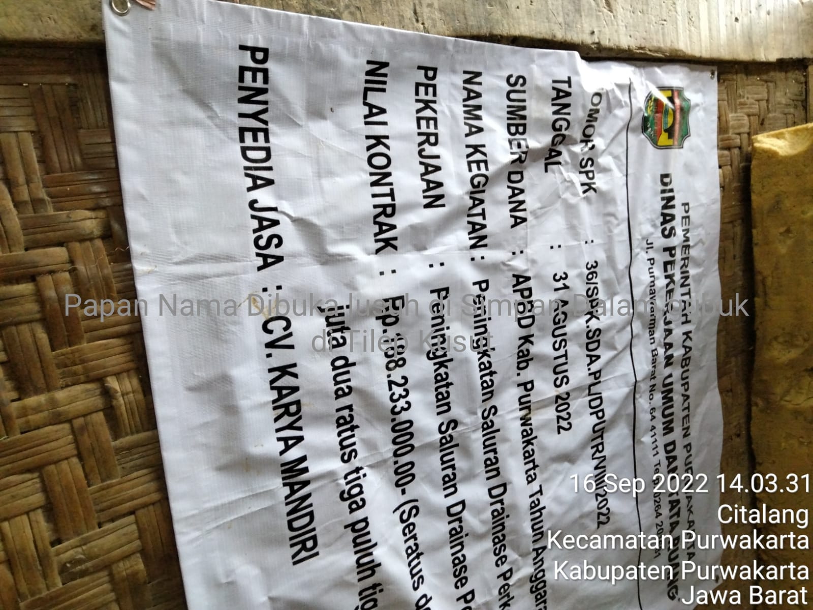 Lain halnya dengan proyek peningkatan saluran drainase perkotaan ,melalui Dinas Pekerjaan Umum dan Tata Ruang ( DPUTR ).Sumber Dana APBD Kabupaten Purwakarta Tahun 2022, dengan Nilai Kontrak Rp .188. 233 000,-(Seratus delapan puluh delapan juta dua ratus tiga puluh tiga ribu rupiah ),dengan penyedia jasa CV. KARYA MANDIRI .Dengan lokasi Desa Citalang Rt 4/1 ,Kecamatan Purwakarta ,Kabupaten Purwakarta,terkesan main petak umpet papan namanya lalu di simpan terlipat kusut di dalam gubug, seperti ada yang di rahasiahkan berusaha untuk di tutup-tutupi