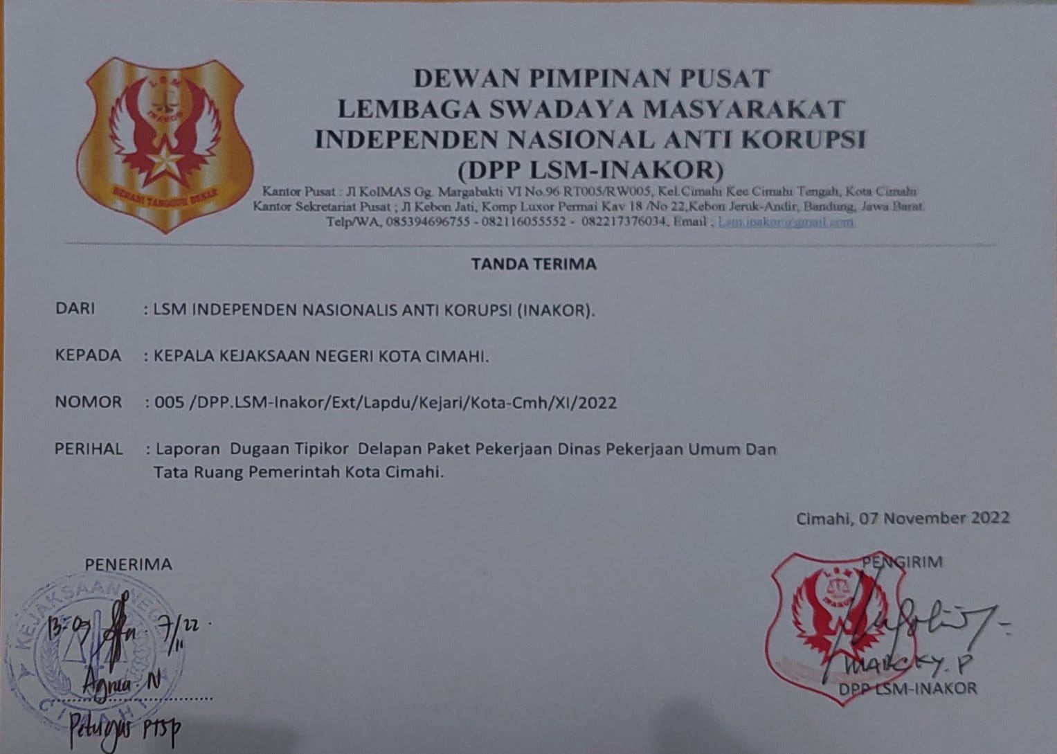 CIMAHI,BANDUNG BARAT | Pada hari Senin, 07 November 2022 Pukul 13.09 WIB, DPP LSM-INAKOR Melaporkan dugaan Tindak Pidana Korupsi pada 8 paket pekerjaan pemeliharaan jalan berkala sebesar sebesar Rp. 464.825.967,67 Dana Alokasi Khusus Tahun Anggaran 2020.
