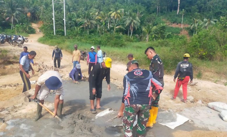 Kepulauan Taliabu, gerbangdesanews.com- Satgas Satuan Organik Maluku Utara Yonarhanud 3/YBY Pos Koki SSK 1 Lede membantu kegiatan perbaikan jalan yang rusak di Dusun Liangsia, Desa Balohang, Kecamatan Lede, Kabupaten Pulau Talibau, Sabtu (14/01/2023).