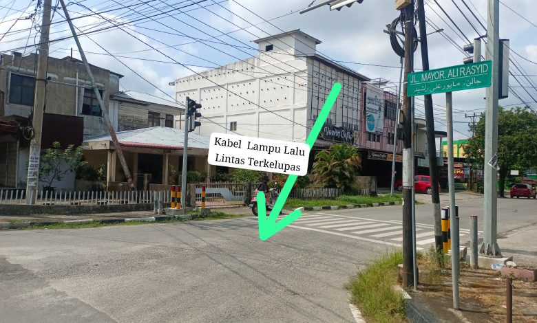 Perlintasan jalan besar Pekanbaru Bangkinang tepatnya persimpangan Jalan Mayor Ali Raysid kabel listrik lampu lalu lintas( Lampu Merah)