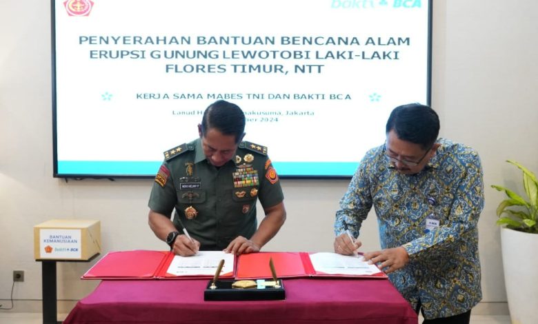Aster Panglima TNI Mayjen TNI Novi Helmy Prasetya mewakili Panglima TNI Jenderal TNI Agus Subiyanto bersama Direktur BCA Antonius Widodo Mulyono menandatangani berita acara penyerahan barang bantuan bencana alam dan selanjutnya menyerahkan secara simbolis kepada Kru Pesawat Hercules A-1341 TNI AU yang akan mengantar bantuan tersebut.