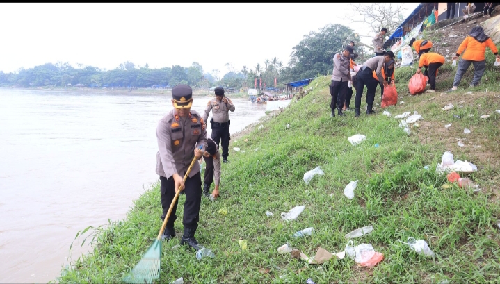 Polres Kuansing Gelar Kegiatan Bersih-Bersih Sungai di Arena Pacu Jalur Tepian Narosa