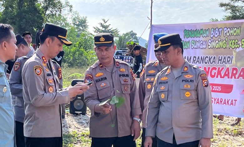Kuantansinginggi Riau || gerbangdesanews.com– Polres Kuantan Singingi bersama masyarakat menggelar kegiatan penanaman bibit pohon Sebahu sebanyak 1000 batang di bantaran Sungai Botuang, Desa Logas, dan Sungai Lombu, Desa Logas Hilir, Kecamatan Singingi, Kabupaten Kuantan Singingi. Kegiatan ini menjadi bagian dari rangkaian peringatan Hari Bhayangkara ke-79 serta bentuk nyata dukungan Polri terhadap pelestarian lingkungan, Kamis (19/6/2025).