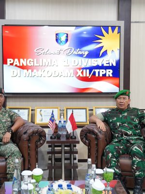 Pangdam XII/Tanjungpura Mayjen TNI Jamallulael, S.Sos., M.Si., menerima kunjungan dari Panglima Divisyen Pertama (Panglima 1 Divisyen) Infanteri Malaysia, Mejar Jeneral Datuk Khairul Anuar Bin Abdul Azis. Bertempat di Makodam XII/Tpr, pada Rabu (2/7/2025).