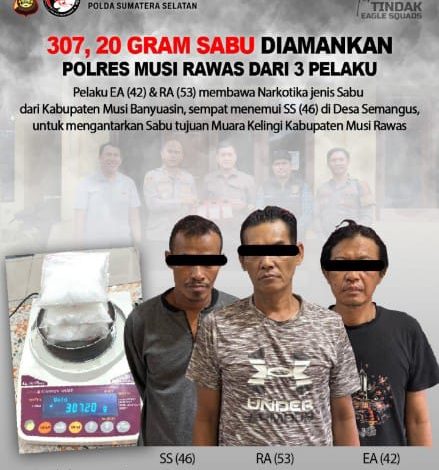 Gerbangdesanews.com || Musi Rawas – Polres Musi Rawas berhasil amankan 3 kantong narkoba jenis sabu dengan berat (bruto) 307,20 gram di Desa mambang Kecamatan Muara Kelingi Kabupaten Musi Rawas.