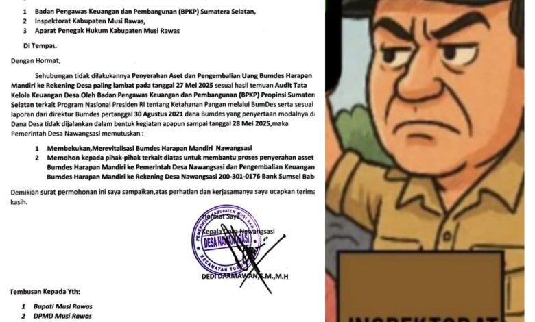 Gerbangdesa || Palembang – 12/10/2025 Terkait Dana Bumdes Desa Nawangsasi, oknum Ketua Bumdes Nawangsasi yang lama (Sdr Hermanto) tidak bertanggung jawab atas Dana Bumdes yang dipakai oleh oknum-oknum pribadi, bukannya untuk Usaha sesuai fungsinya malah dipinjamkan, dan sampai sekarang dibiarkan saja. Sesuai informasi yang kami terima dari beberapa sumber, hasil yang ditemukan oleh BPKP Sumatera Selatan pada bulan Mei 2025 tercatat dilaporan ketua bumdes lama Sdr Hermanto pertanggal 31 Agustus 2021 dan ditandatangani oleh Bendahara Bumdes sdr Tri Bambang Sanyoto dipakai oknum oknum pribadi diantaranya: