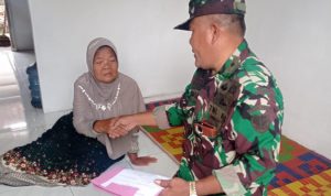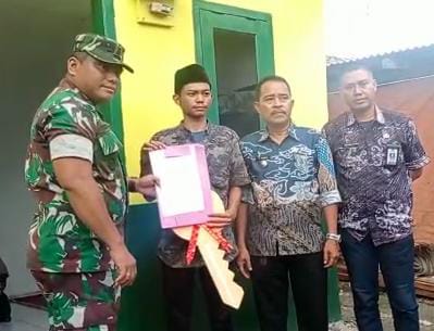 Serang, gerbangdesanews.com– Danramil 0602-16/Ciruas Lettu Inf Yusrizal mewakili Dandim 0602/Serang Letkol Arm Fajar Catur Prasetyo, SE., menyerahkan kunci rumah yang telah selesai diperbaiki kepada Ibu Khujenah (61) warga Desa Singamerta Kampung Wakaf Desa Singamerta Kecamatan Ciruas Kabupaten Serang, Kamis (16/2/2023) kemarin.